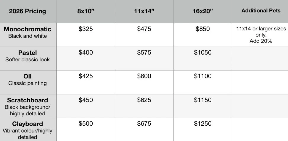 *Pastel and Clayboard portraits: price includes a simple background, for more complex or detailed backgrounds contact me for a quote